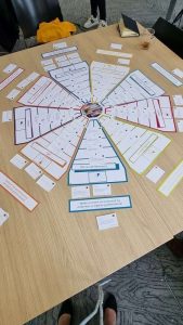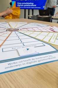 Bij de masterclass waren ongeveer 30 personen aanwezig: i-coaches, schoolleiders, ict-ers, programmamanagers en ook een aantal zzp-ers die dit soort trajecten begeleiden bij onderwijsstichtingen. In de ruimte waren drie tafels waar we konden plaatsnemen en op deze tafels lag het Visiespel Digitale Geletterdheid al voor ons klaar. Na een presentatie van Gäby van de Linden en Martin Klein Tank werd al snel duidelijk dat het altijd belangrijk is om een duidelijke visie te hebben en dus ook op Digitale Geletterdheid. Het spel was op de drie tafels zo neergelegd dat er negen taartpunten waren.